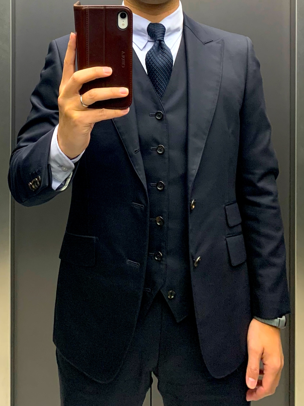 ブルー系のネクタイ、ブルー系のスーツセット、ブルー系のビジネスシャツを着用したメンズの冬コーディネートの1枚目の写真
