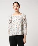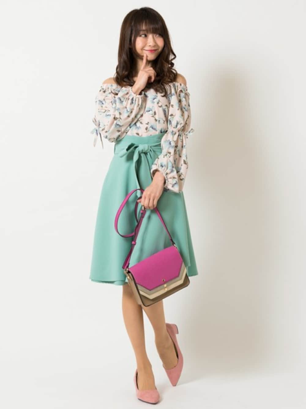 ラップデザインのウエストリボンスカートと花柄ブラウスのコーデです♪