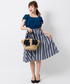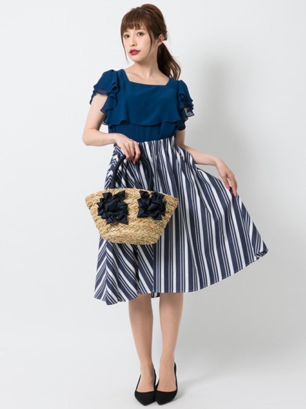Rew de Rew(ルゥデルゥ) のフリルブラウス、ウエストゴムアシメスカート、リボン付かごバッグの コーデです♪ ネイビーカラーで統一感をだしました♡ 爽やかな通勤コーデです♪
