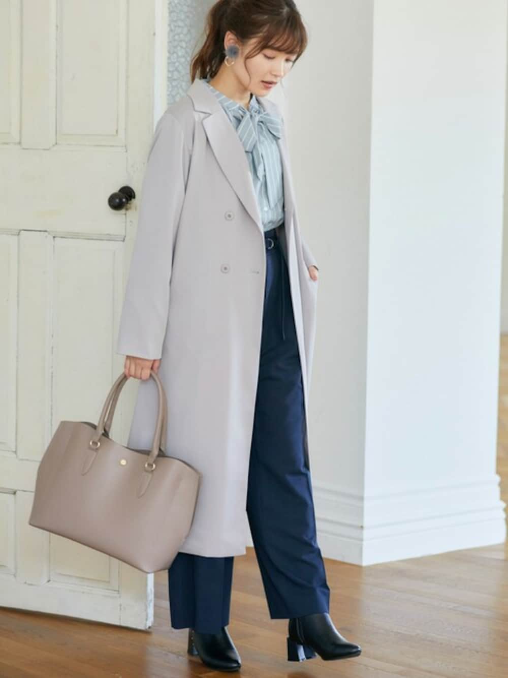 トレンドのリボンタイを取り入れたオフィスカジュアルコーデ。