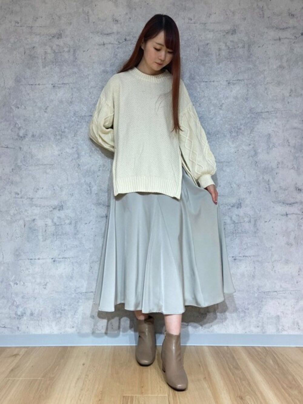 サイドジップがアクセントになったニットは フレアスカートならファスナーを開けて、 パンツなら閉じて着るとバランスよく着られます。 サテンスカートはフレアシルエットが綺麗な1着。
