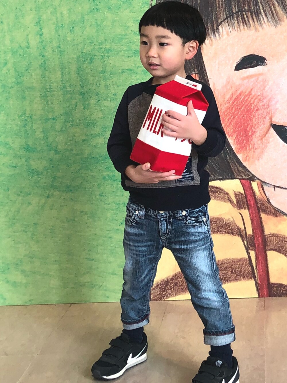 ご覧いただきありがとうございます。 林明子さんの原画展に行きました。 はじめてのおつかいの牛乳を持ってパチリ。 着まわしってかおんなじようなコーデばっかりですね。 このスウェットもデニムも今年までかなー。。 来年もFITHのデニム欲しい。。けど高い。。。