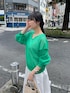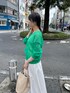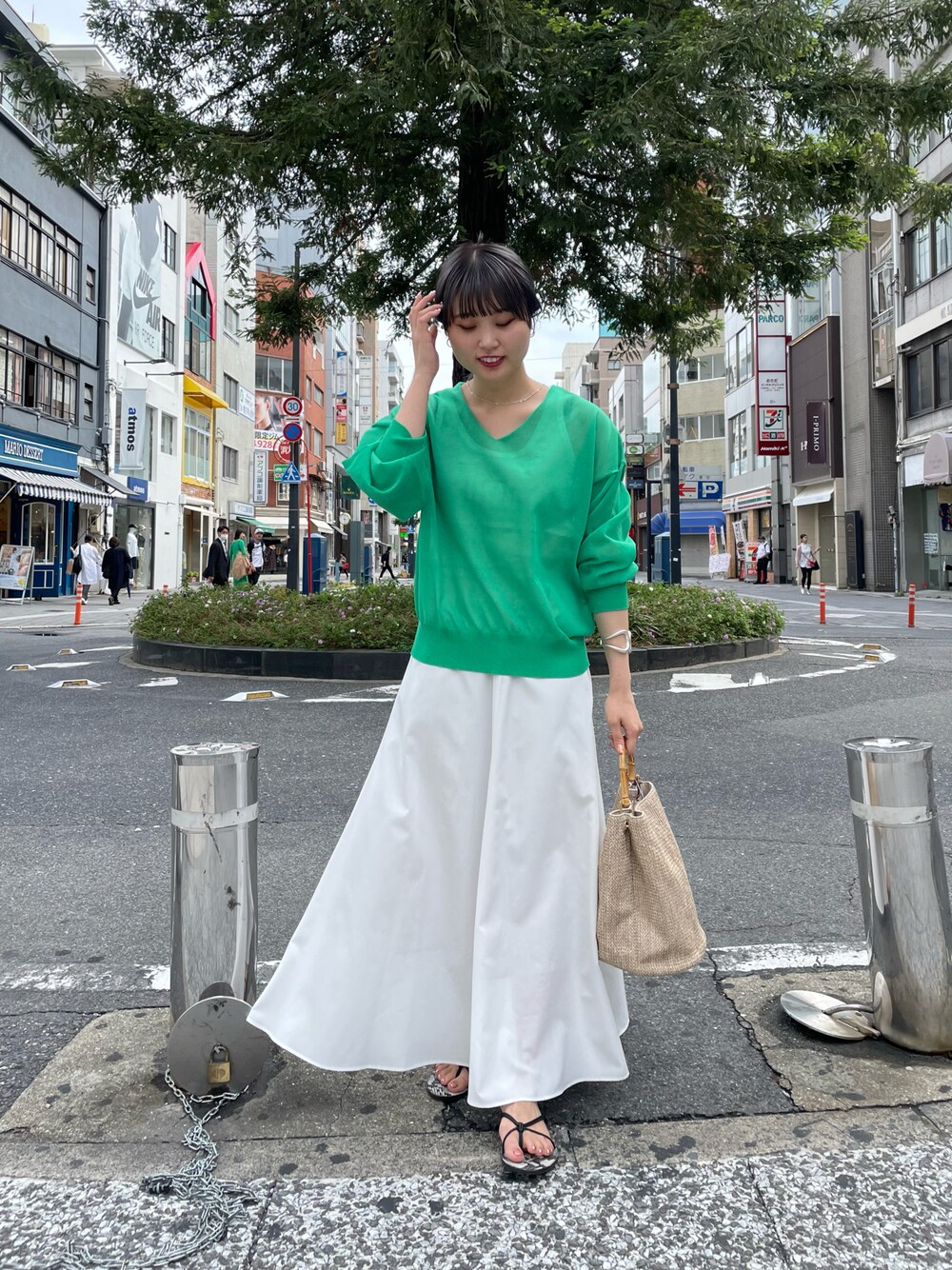 爽やか夏コーデ○ ○トップス シアー感たっぷりのサマーニット。薄手素材で暑くなってきた今の季節もこれからの季節も着ていただけます。 グリーンが爽やかで1枚で主役になってくれるトップスです。 Vに開いた首元のお陰でスッキリ見えも嬉しいポイント○ ○スカート 1月に発売されたこちらのスカート。 お客様に大人気で追加生産になりました^^ 程よく広がるフレアスカートで、甘くなりすぎず、どんなトップスとも合わせやすいです。