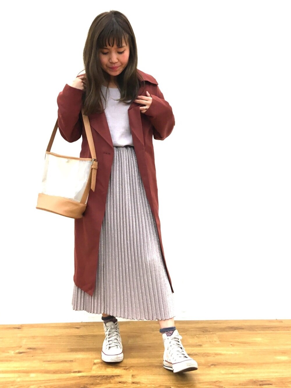 ブラウンのトレンチコートも 合わせる色で春らしくなります! ニットは週一で着てますが 毛玉になりにくく合わせやすいので重宝してます! スカートはラメプリーツで女性らしいです。 足元はコンバースでカジュアルに仕上げました。