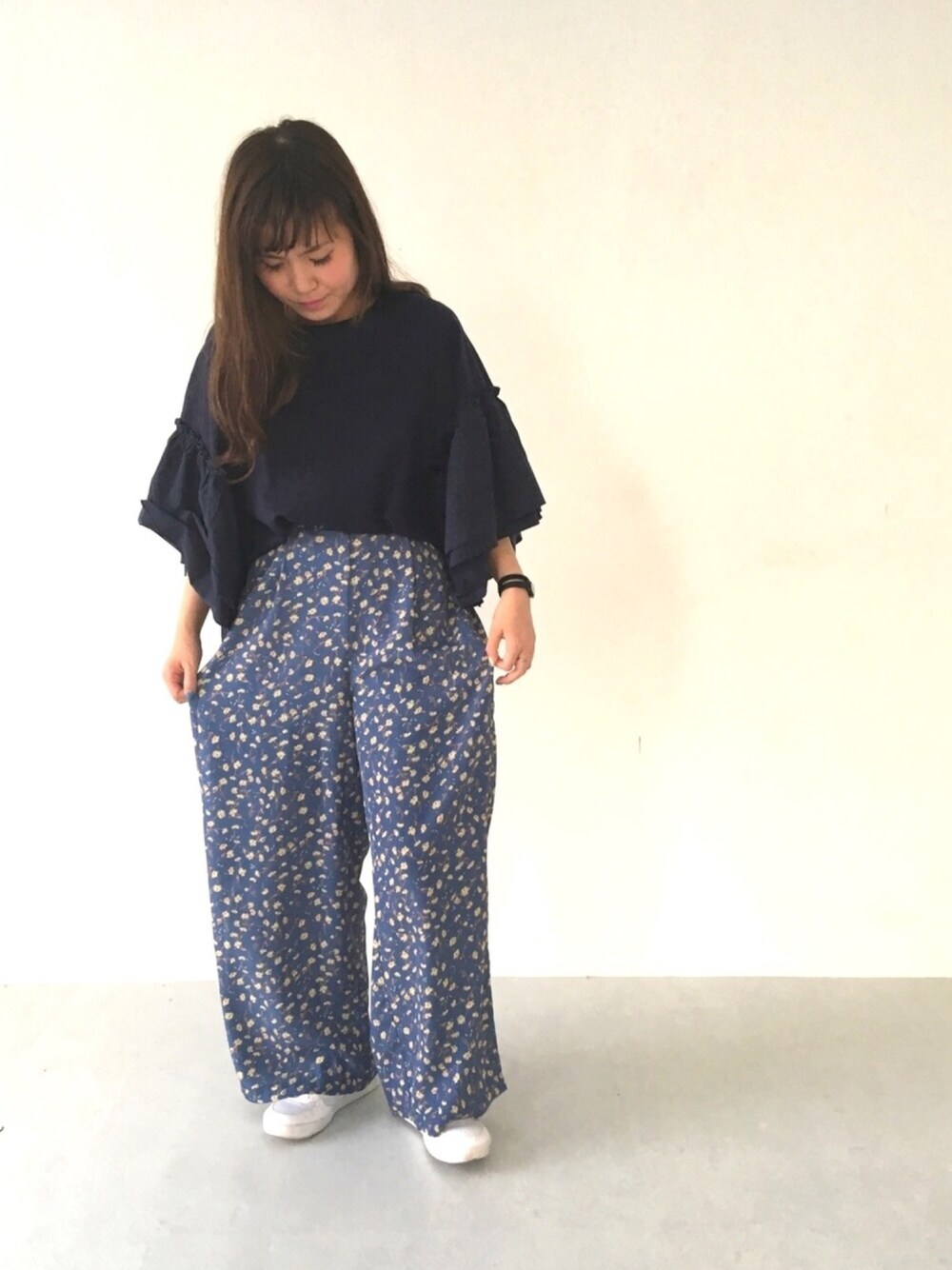 ゆったりコーデ。 バタフライ袖がポイントのトップスは 腕が細く見えるので◎。 ワイドパンツは旬の花柄! 落ち着いたブルーが良い感じ♩
