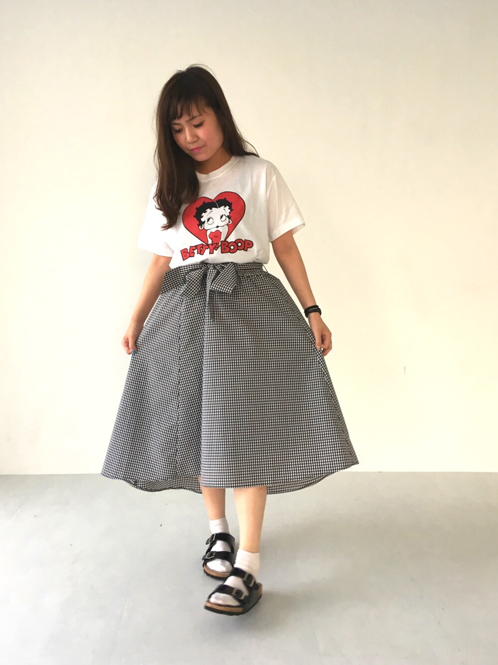 ベティーT×ギンガムスカート。 ベティーちゃんがかわいい♡ スカートは風に揺れるくらい軽いです。 ウエストゴムなので楽チン! ヒールと合わせたらより女性らしさアップします!