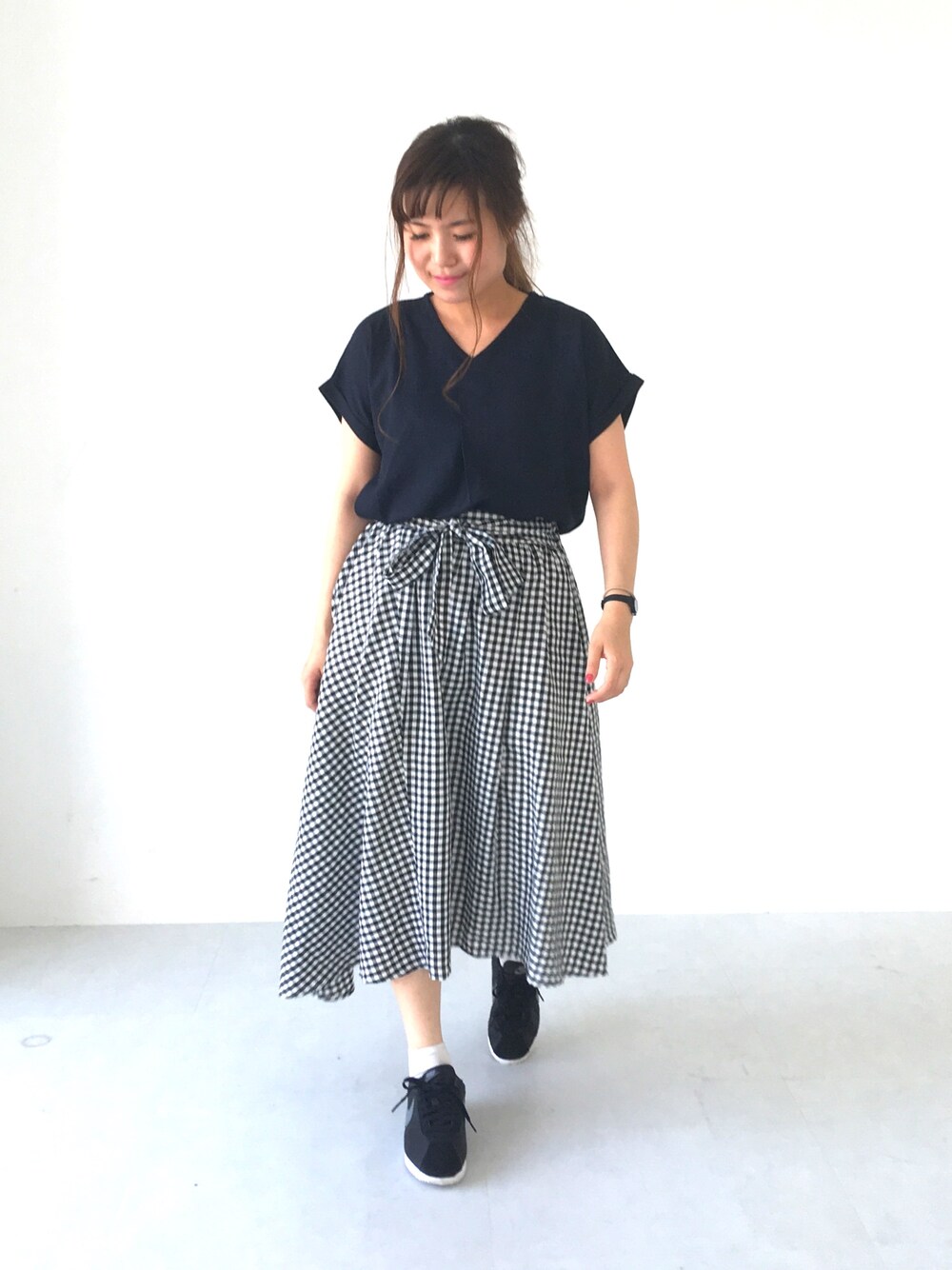 ひさびさのギンガムチェック。 トップスはシンプルなブラウス。 オフィスなどにも最適です。 スカートは斜めになったイレヘムスカート。 揺れるので女性らしさアップ! あえてスニーカーで カジュアルにしました!