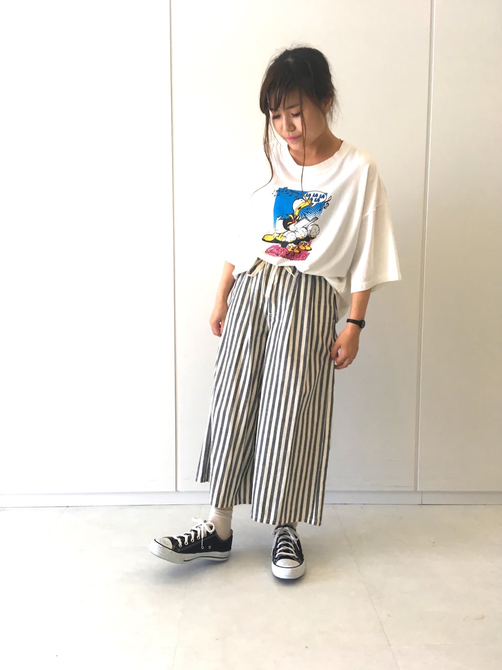 夏コーデ。 ドナルドTは歌を歌っているデザインでとにかくかわいい❤️ ドロップショルダーになっていて ビッグTぽくなるので ゆったり着こなせます! ボトムはLeeのガウチョ。 ウエストはボタンとチャックです! サンダルと合わせても🙆♀️