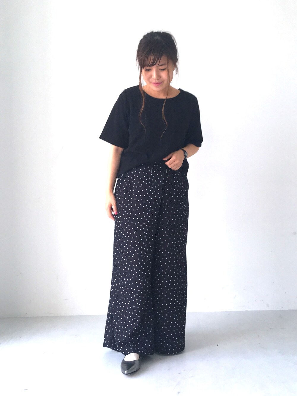 ブラックコーデ。 トレンドのドットを ちょっと大人っぽく! . トップスは柔らかい生地で 肌触り良いです。 合わせやすいので着まわし抜群。 . ボトムはラップ風になってるので 周りと差がつくデザイン! ウエストはゴムでヒモでもしばれるようになってます。