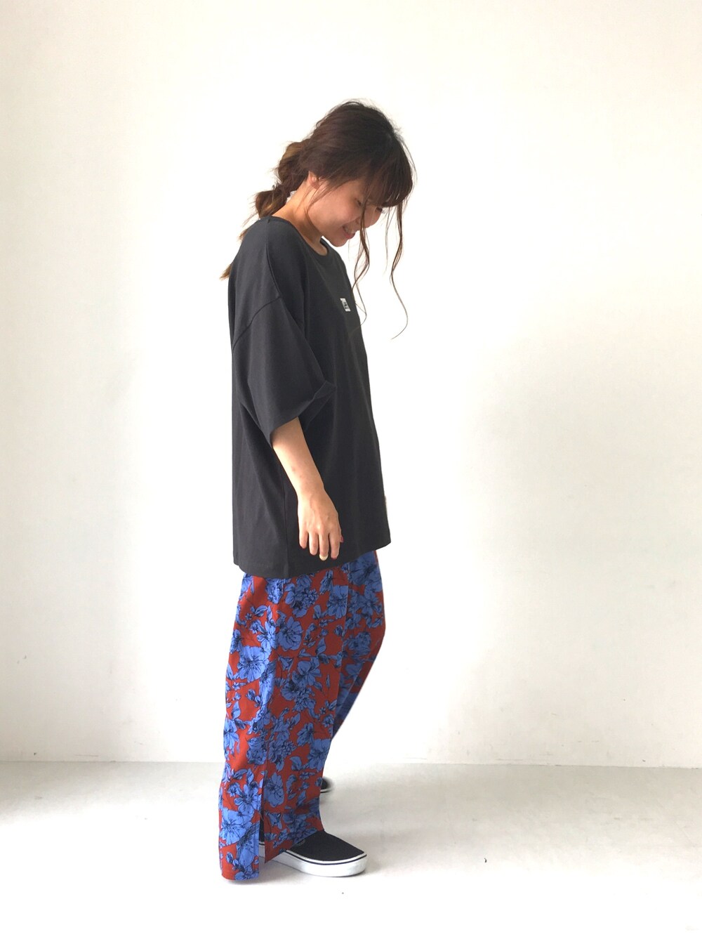 たまねぎヘアにゆるコーデ。 ウエストインはしないゆったりスタイル。 LeeのロゴTビッグシルエットで可愛いです! 花柄ワイドパンツは スリットが入ってて抜け感だせます! ウエストゴムなので ストレスフリー。