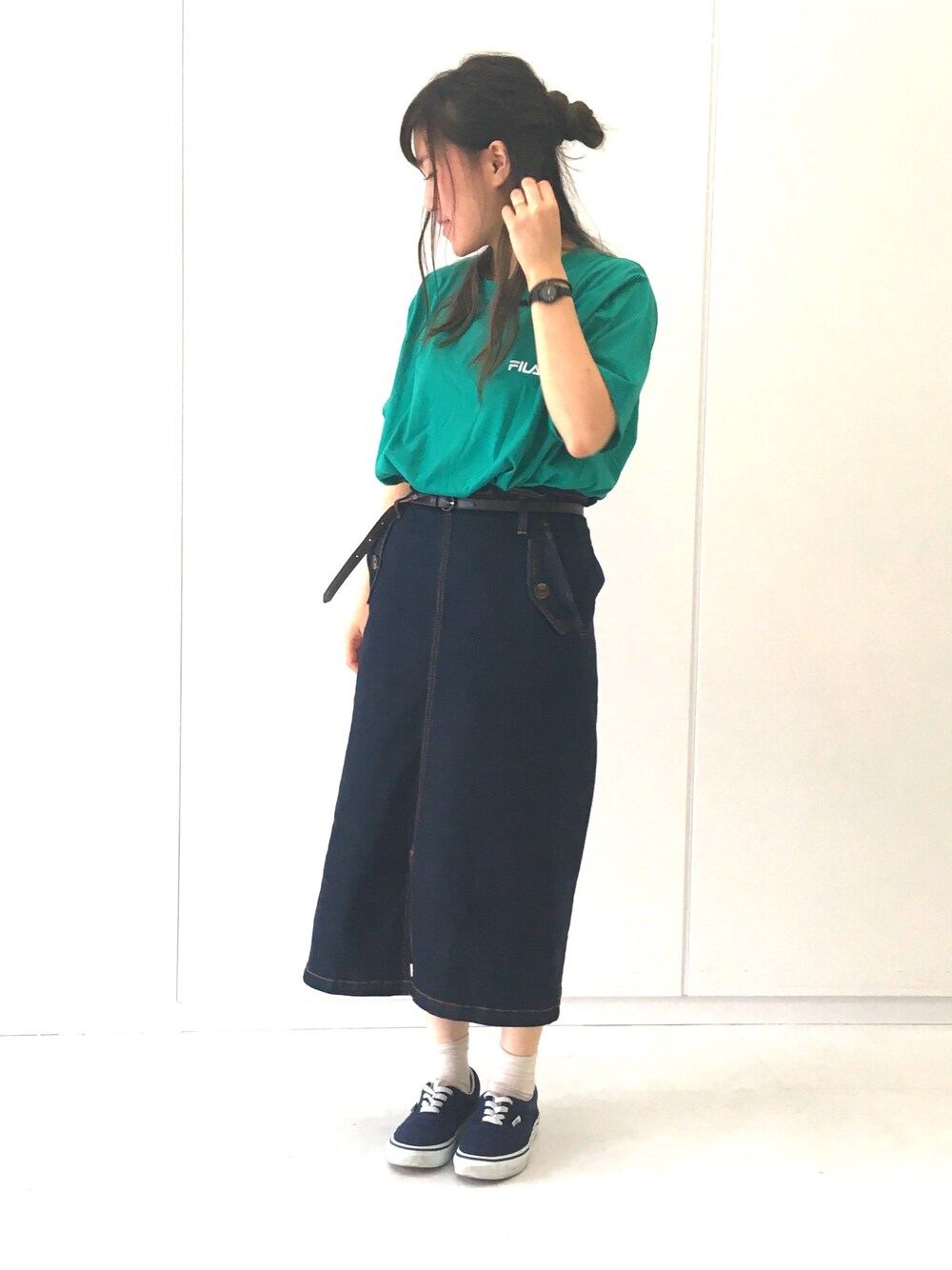 FILA T×デニム。 ゆったり目のTシャツには タイトスカートが◎。 FILAのロゴがワンポイントに! デニムスカートは 前スリットで大人っぽい印象をプラスしてくれます!