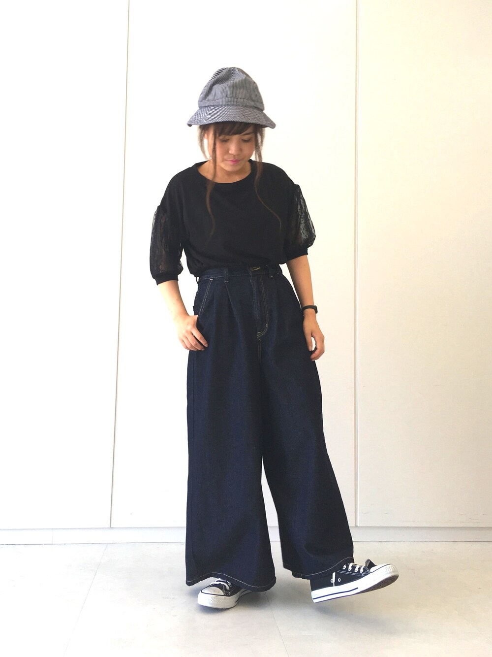 袖部分がドット柄のシースルーデザインになってます! トップスが可愛らしいので ボトムはデニムでカジュアルに 仕上げました! このボトムは本当にシルエットが綺麗です! ※本日限定 zozotownにて タイムセールと1000円クーポン 同時開催中! ほんとにお得です!