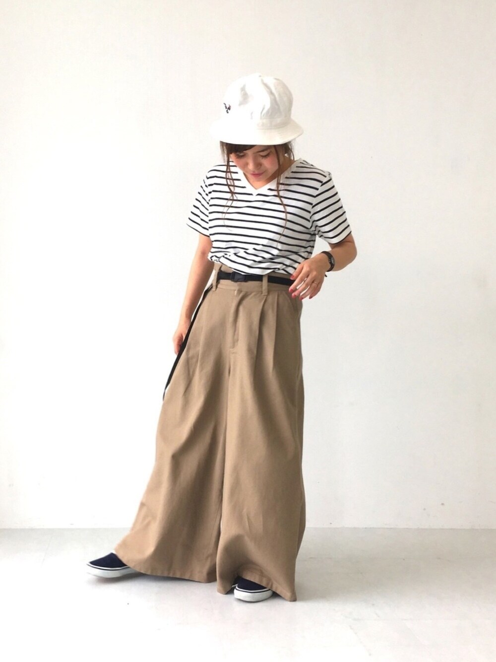 カジュアルコーデ。 ボーダー×ワイドパンツ。 やっぱりTシャツはVネック派。