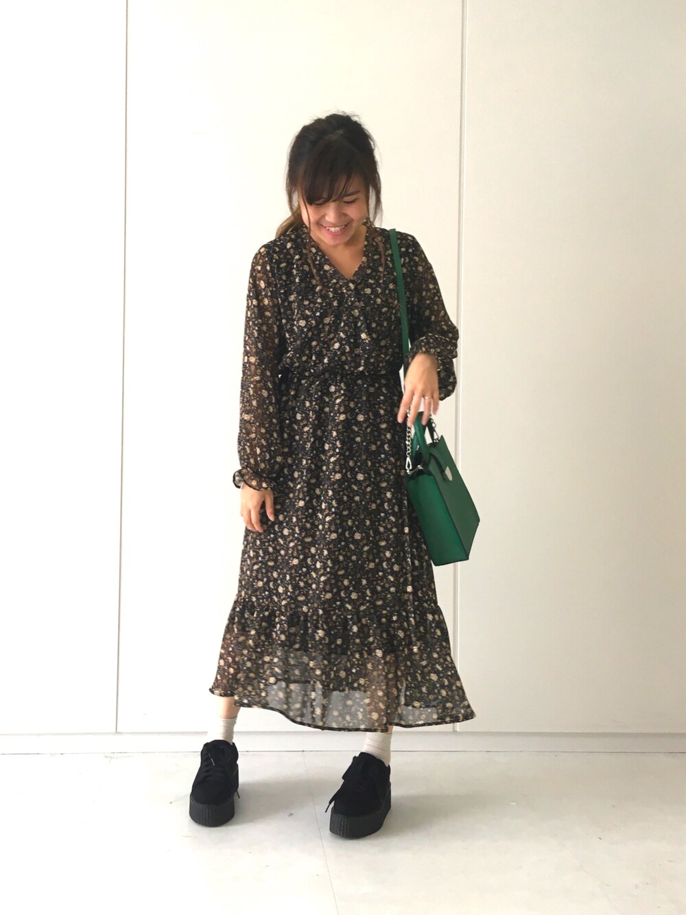 花柄ワンピース。 女性らしさ満載。 動くたびに揺れるワンピースは デート服としても最適です! 甘すぎないように 足元はスニーカーで!