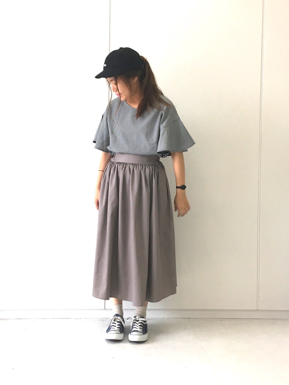 チェックブラウス×スカート。 ガーリーコーデは似合わないので キャップとスニーカーで カジュアルに仕上げました! トップスは2wayなので Uネック、Vネック ともに楽しめます★ スカートはウエスト部分が太めになってるので細見え効果大! 丈感もベスト!