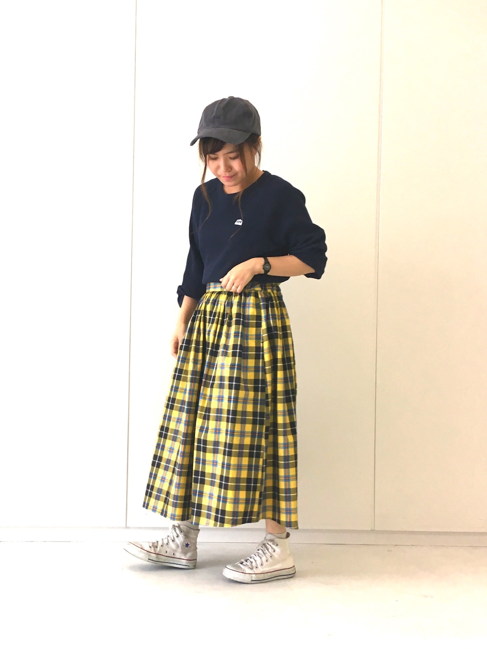 Lee ワッフルT×チェックスカート 古着系コーデに! トップスは胸元に入った ちっちゃいロゴがポイント! チェックスカートは ちょうど足首が出る長さなので 細見え叶います!