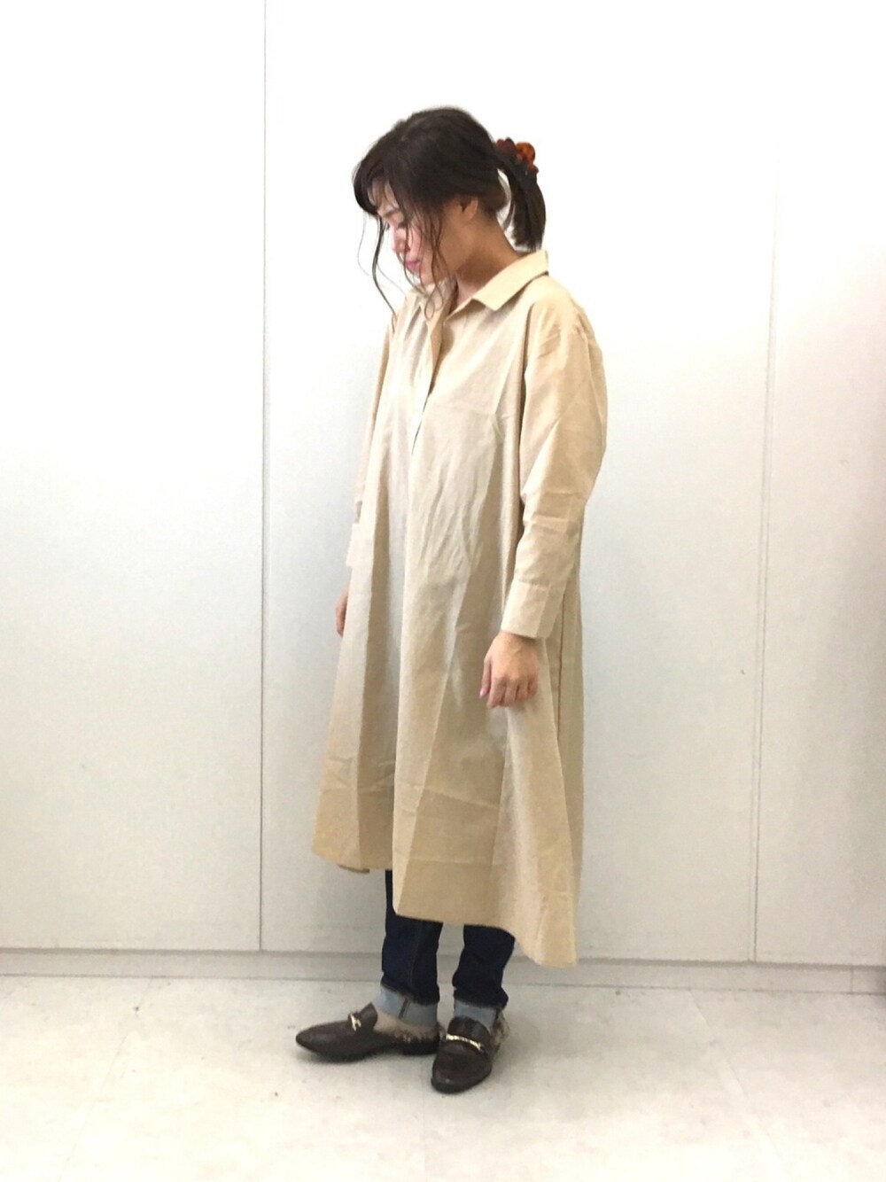 シャツワンピ×スキニー。 体型カバーにも◎ 首元がVネックになっているので オーバーサイズでも スッキリして見えます。 オンオフ着回せる優れもの!