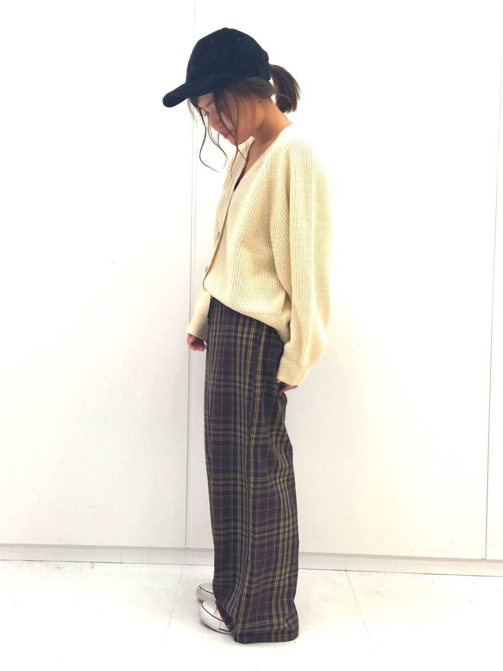 新作のチェックパンツと ニットカーディガン! 脚長効果のチェックパンツは ゆるっと履けて楽チン!