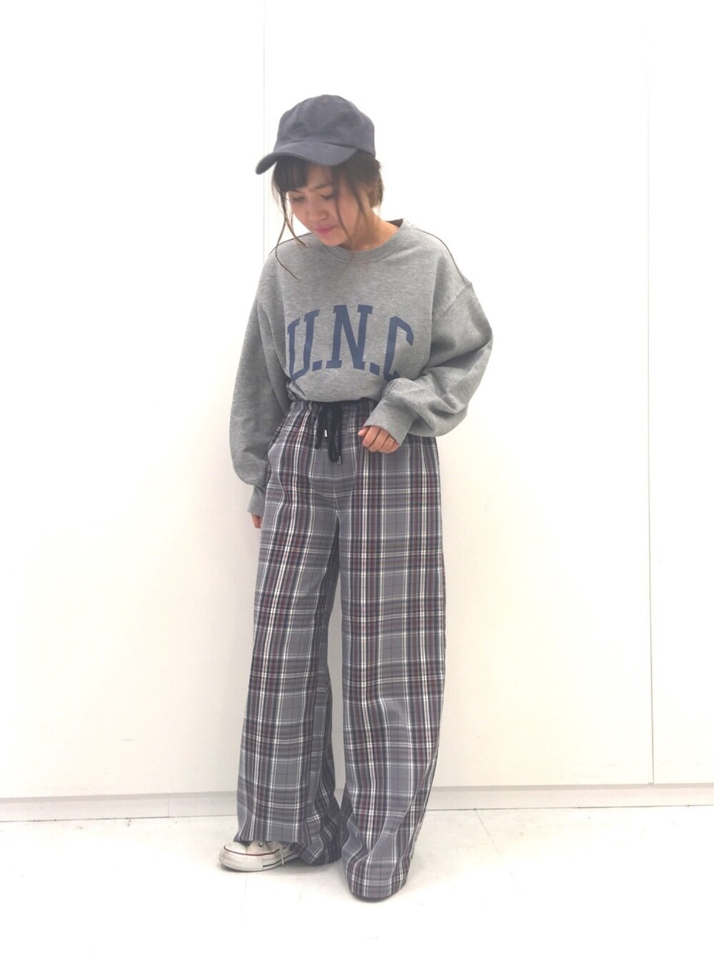 ロゴトップス×チェックパンツ! 脚長効果あります!