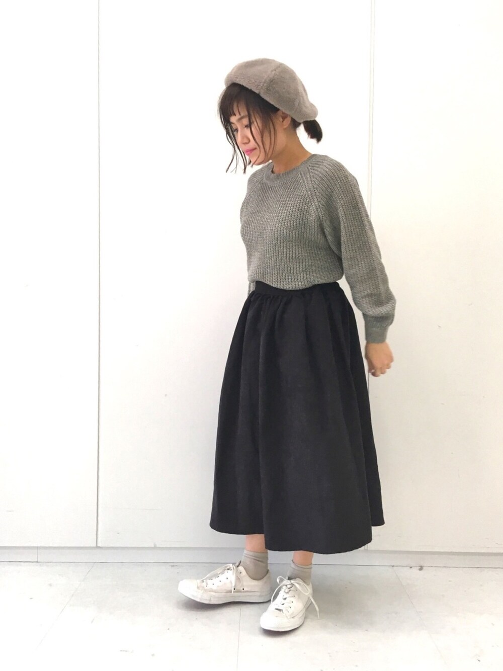 シンプルコーデ。 ボリューム感のあるスカートが 女性らしさを引き立ててくれます!
