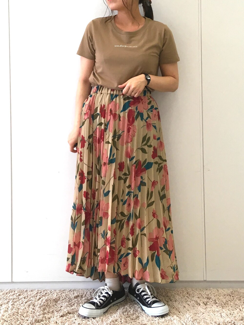 ベージュコーデ! 新作のスカートは 花柄のプリーツで らしい1枚です。 年齢問わず履けるのでおすすめ!