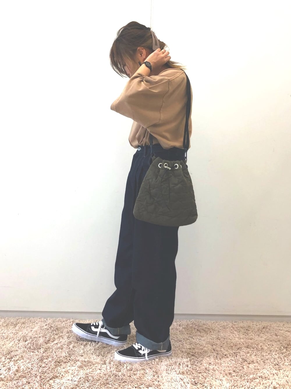 カジュアルスタイル。 オーバーサイズのトップスは デニムとの相性抜群です。