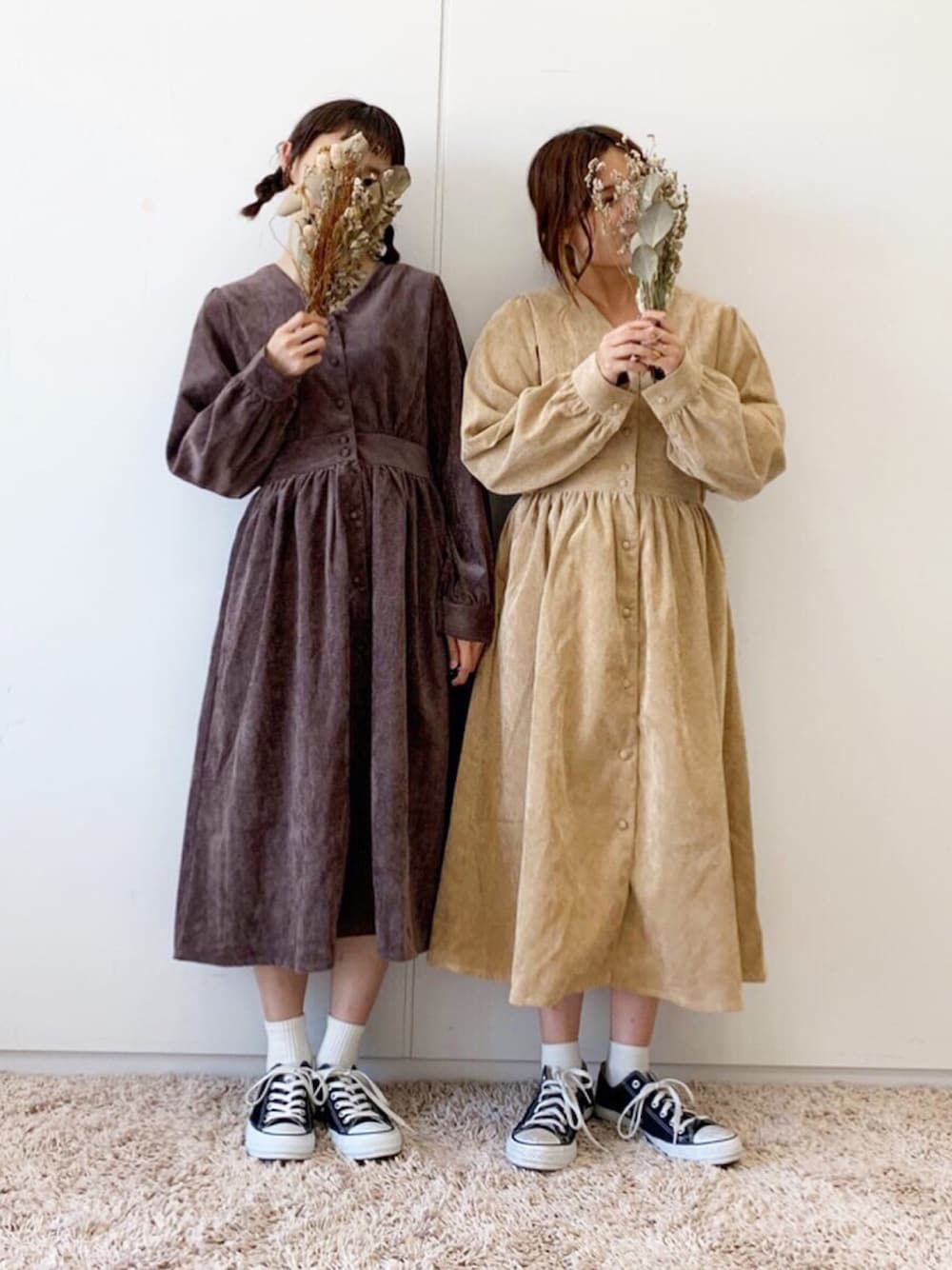 ふたわたりのワンピース「コーデュロイ前開きワンピース *」を使ったコーディネート