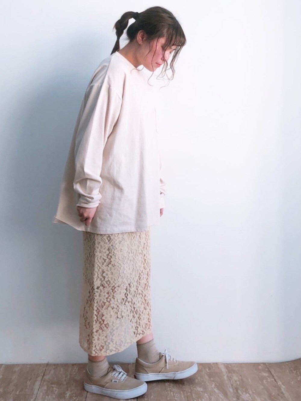 ワントーンコーデ。 オーバーサイズのロンTに タイトスカートでメリハリをつけました。 レーススカートは オンオフ使えるので便利です。