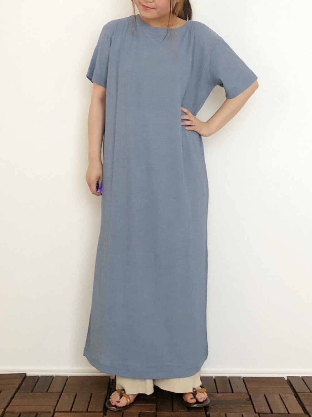 くすみブルーのワンピースに 白のワイドパンツ . ワンカラーのワンピースは 意外と着回し抜群です