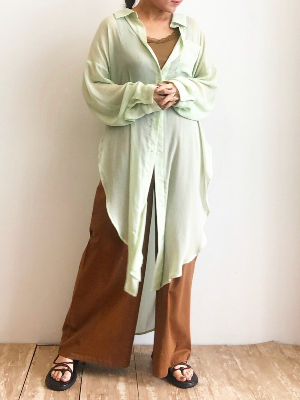 ミントグリーンのシアーシャツに ブラウンのワイドパンツ。 秋でも着られます!