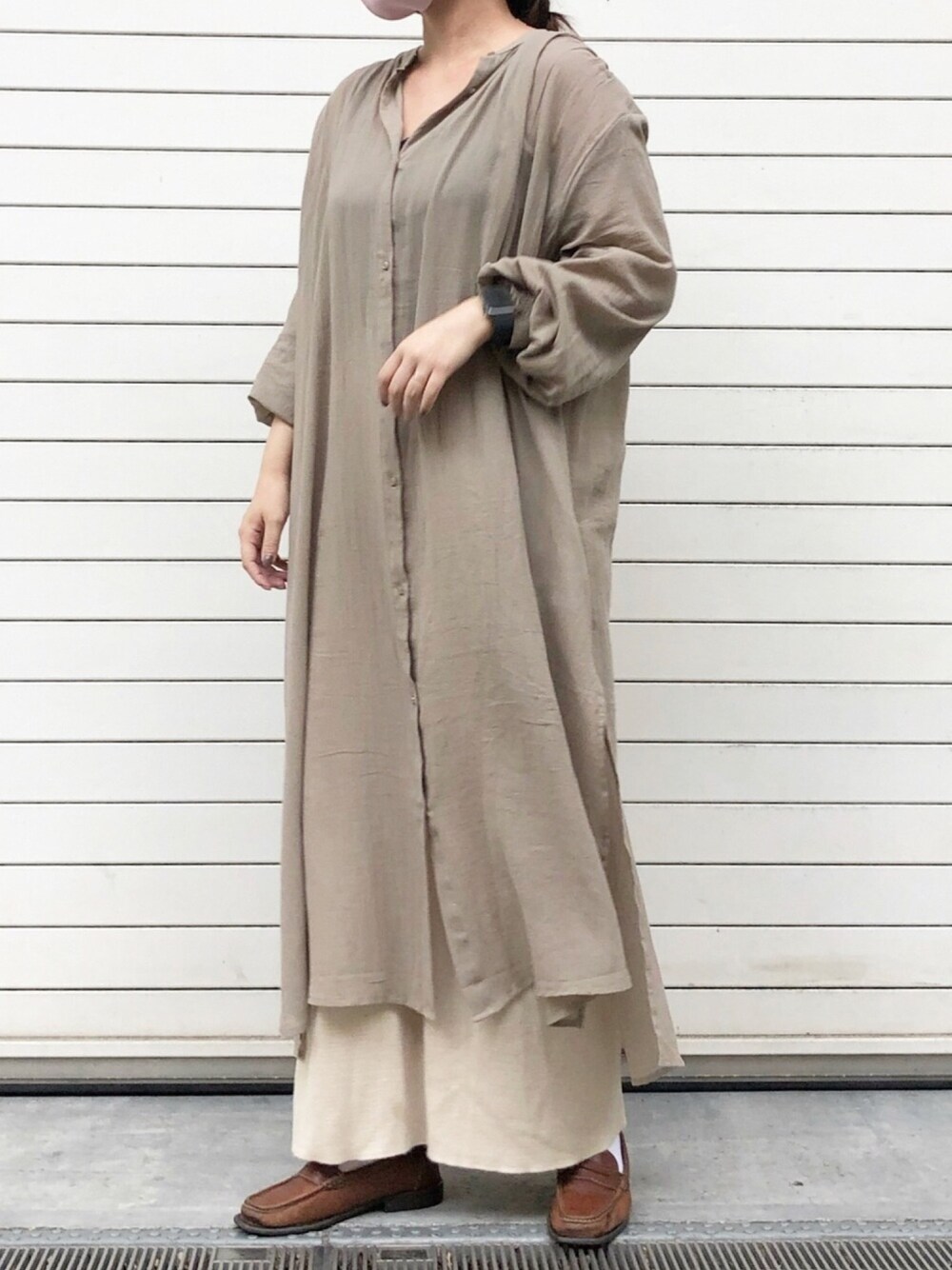 ふたわたりのワンピース「前後ボタンスタンドカラーギャザー2WAYワンピース *」を使ったコーディネート