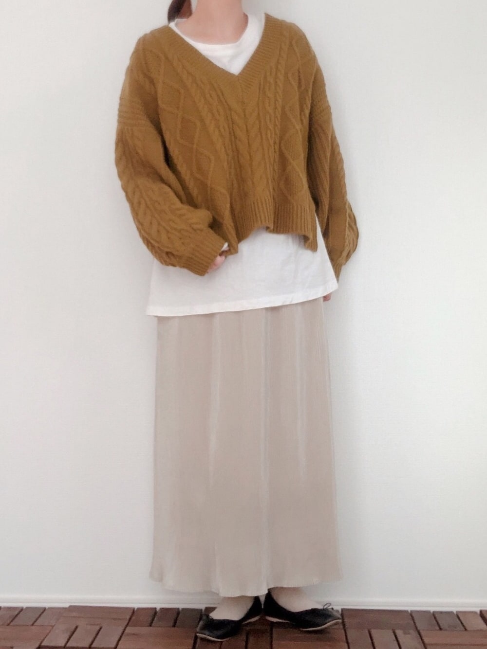 ふたわたりのニット/セーター「【WEB限定】好きな丈Vネックケーブルニット(ショート)*」を使ったコーディネート