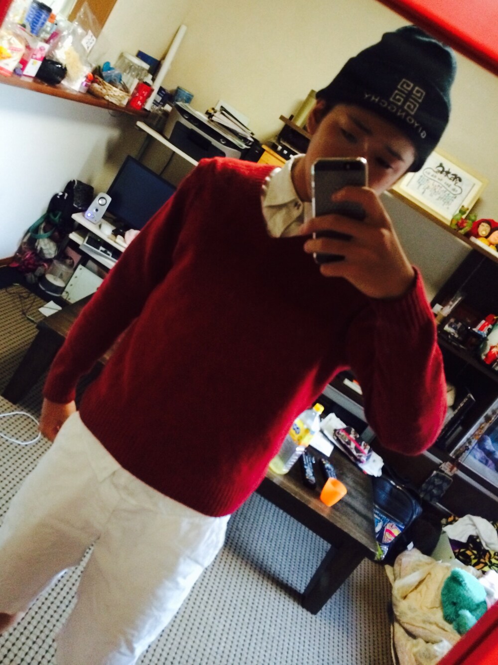 レッド系のニット/セーターを着用したメンズの春コーディネートの1枚目の写真