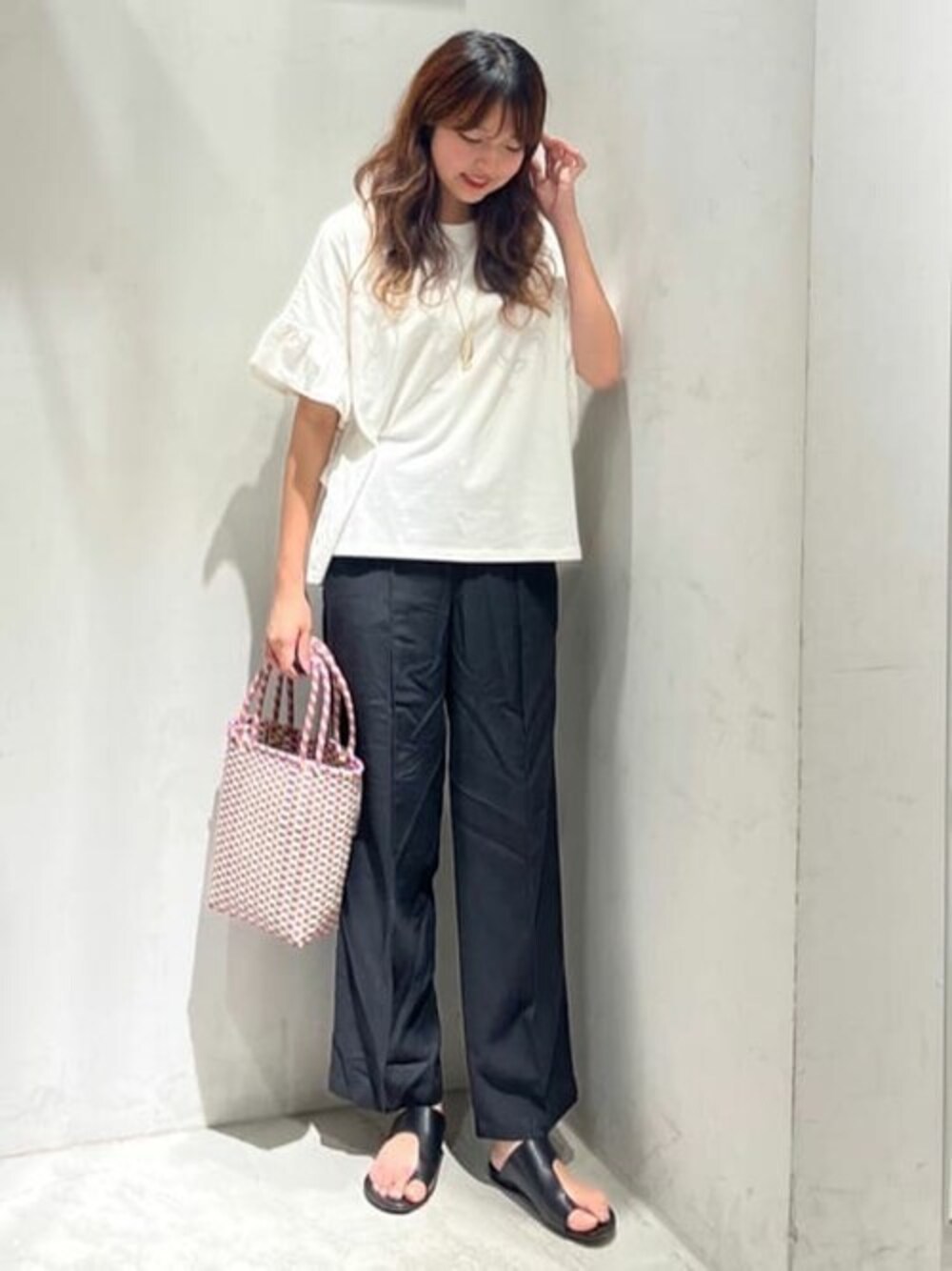 袖のフリルが可愛いカジュアルガーリーコーデ! ◎トップス 今回着用サイズ : Mサイズ ・ゆったりとしたシルエットです。 ・二の腕もしっかりカバーできます。 ◎パンツ 今回着用サイズ : Sサイズ ・ウエストがゴムなので穿きやすいです。 ・脚のラインを拾わないワイドなシルエットです。 ◎シューズ 今回着用サイズ : Lサイズ