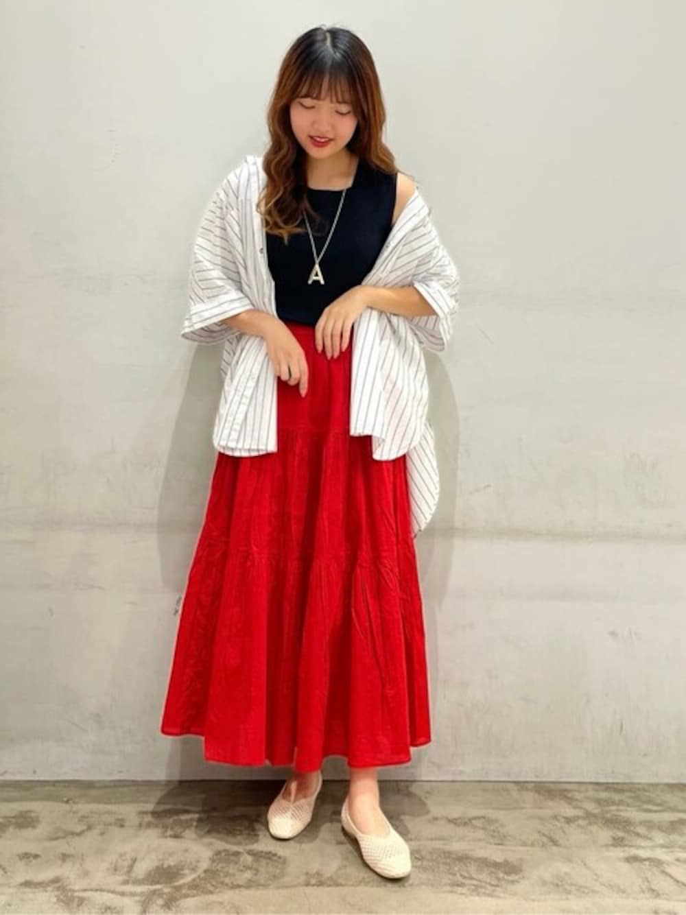 ゆったりシルエットの夏コーデ! ◎トップス 今回着用サイズ : Mサイズ ・ビッグシルエットでお尻周りまでしっかり隠れるので、体型カバーもできるシャツです。 ◎スカート 今回着用サイズ : Mサイズ ・軽い履き心地で夏にもぴったりのスカートです。 ・ウエストがゴムなので穿きやすいです。 ◎シューズ 今回着用サイズ : Lサイズ