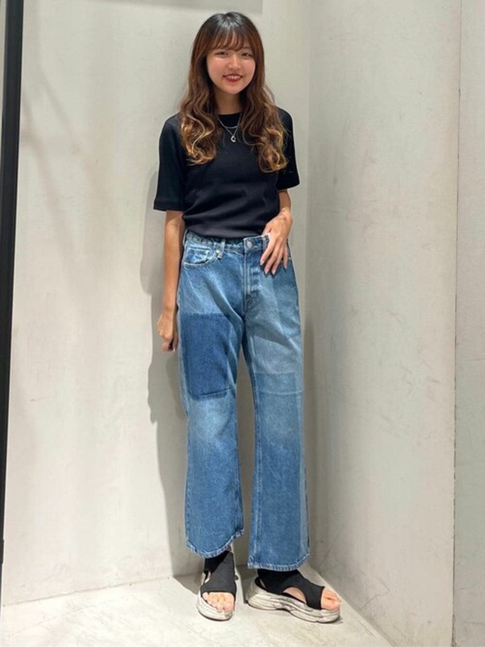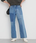 パッチワークのデニムを使ったカジュアルコーデ! ◎トップス 今回着用サイズ : Mサイズ ・伸縮性のあるリブ素材です。 ・透けにくいのでインナーを気にせず着用できます。 ・五分袖で二の腕もカバーできます。 ◎パンツ 今回着用サイズ : Sサイズ ・ワイドなシルエットで脚のラインを拾わないデニムです。 ◎シューズ 今回着用サイズ : Lサイズ