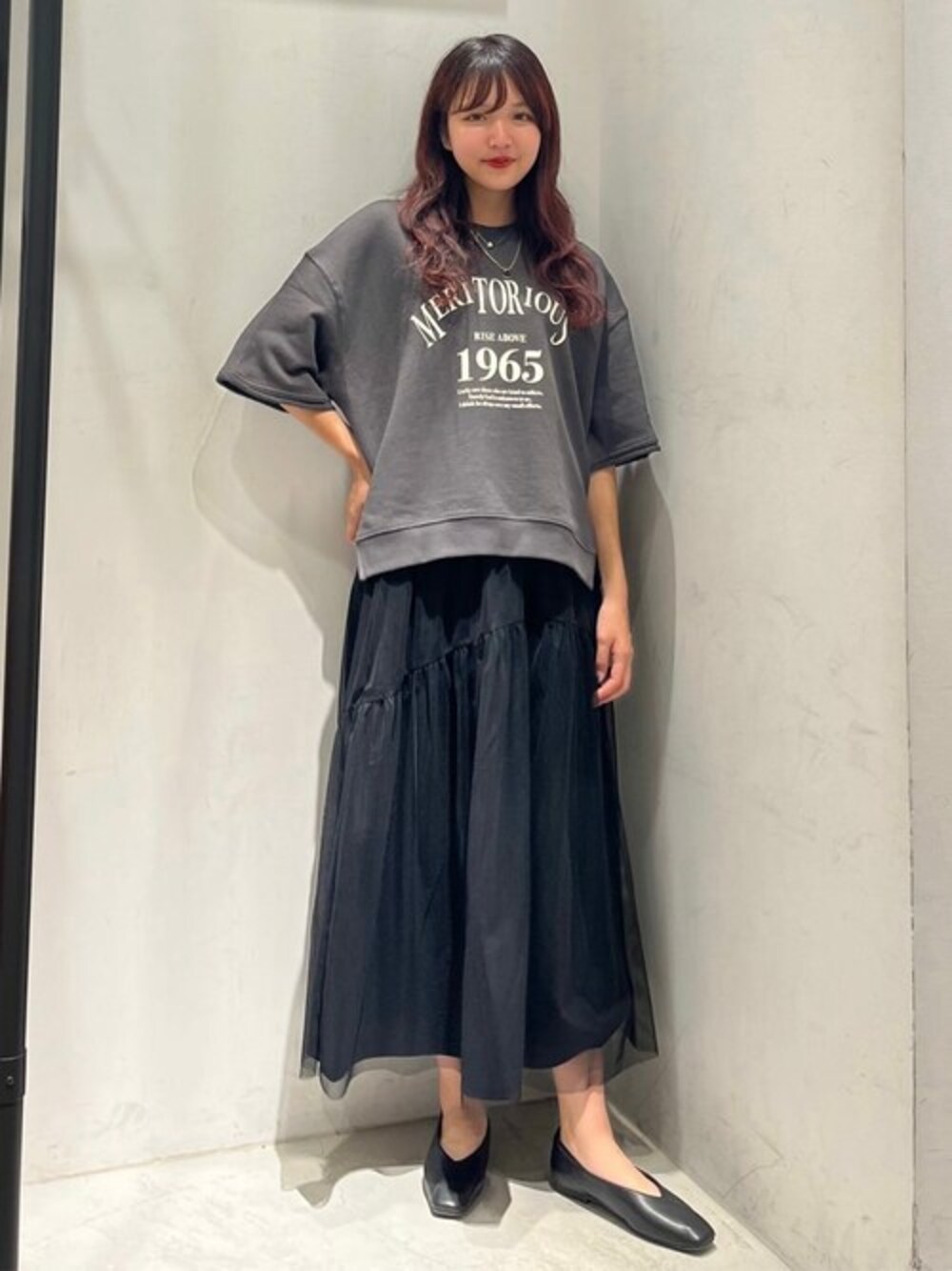ロゴのトップスを使ったカジュアルコーデ! ◎トップス 今回着用サイズ : Mサイズ ・さらっと着られる肌触りの良いミニ裏毛素材を使用しています。 ・袖は二の腕が隠れる丈感です。 ◎スカート 今回着用サイズ : Mサイズ ・チュール素材が組み合わされたスカートです。 ・裏表リバーシブルで着用できるます。 ◎シューズ 今回着用サイズ : Lサイズ