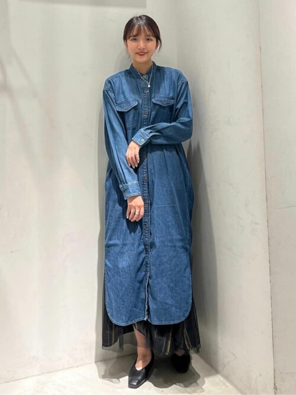 デニムシャツワンピースとスカートのレイヤードコーデ! ◎ワンピース 今回着用サイズ : Mサイズ ・Wポケット付きのデニムシャツワンピースです。 ・背中部分に大きなタックが入っています。 ・ボタンを開けて羽織りとしても着て頂けるアイテムです。 ◎スカート 今回着用サイズ : Mサイズ ・チェック柄の生地にチュール素材がレイヤードされたスカートです。 ・裏表リバーシブルで着用できるます。 ・裾に向かってふんわりと広がるシルエットが可愛いです。 ◎シューズ 今回着用サイズ : Lサイズ