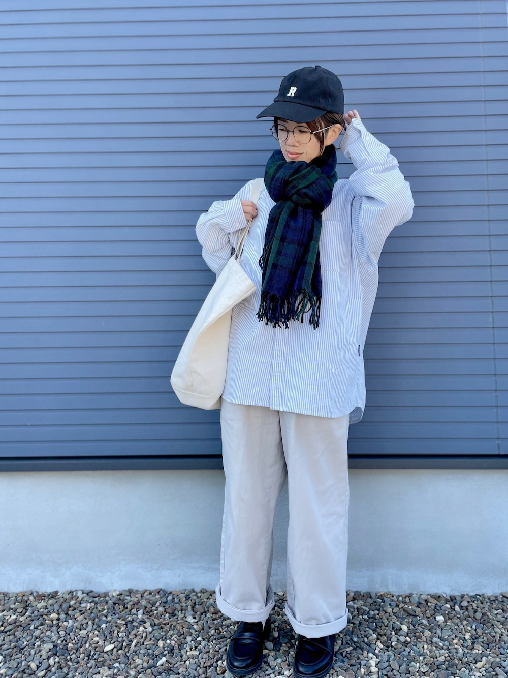ご覧頂きありがとうございます ·͜·♡ いいね♡セーブ🗂嬉しいですꔛ♡ ビッグシルエットなストライプのボタンダウンシャツとワイドパンツでゆるコーデ૮ . ̫. ა チェックのマフラー、実はケープを細く畳んでマフラーっぽくしただけ😝 前回の投稿を素敵なフォルダに入れて下さった方々、ありがとうございました♡ とっても光栄です(*ᴗˬᴗ)⁾⁾⁾✨