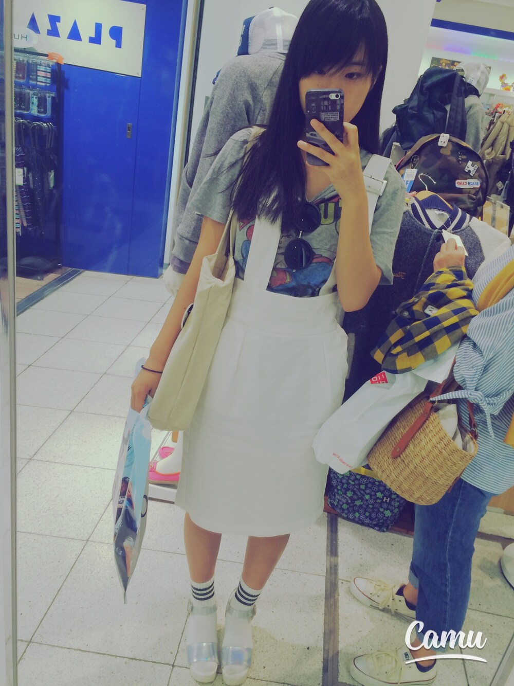 ホワイトのサスペンダー付きタイトスカートに黒のラインソックスであくまでもホワイトがメインで! Tシャツはメンズでカジュアル感はあるけどタイトスカートで女の子らしさを演出してるのがポイントです!
