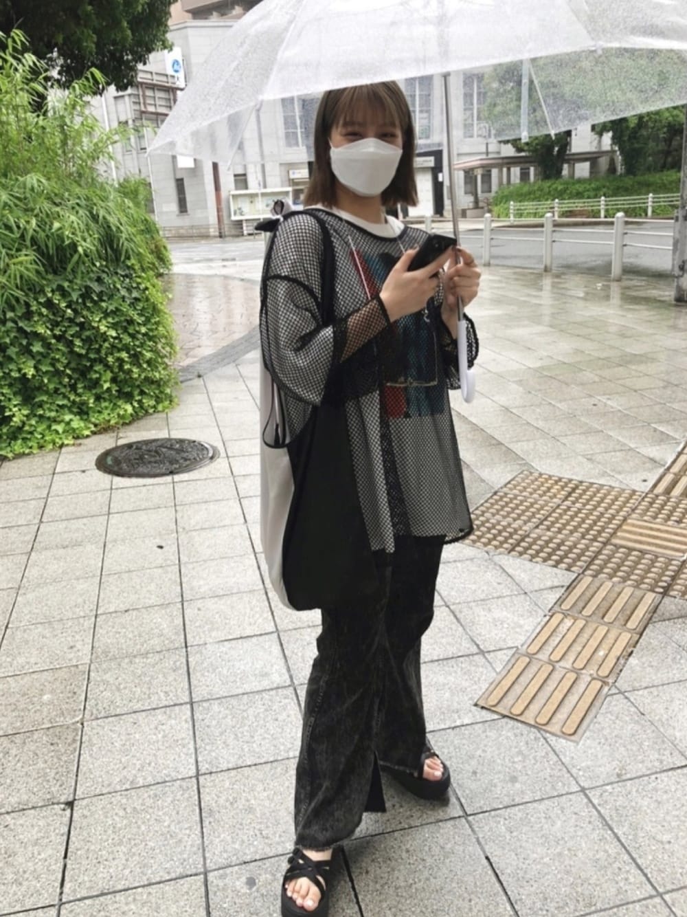 雨の日のお出かけ! 少し肌寒いのでオーバーのメッシュトップスを重ねて更にオシャレ感を出しました🦢 Tシャツもメンズでゆったりめなので パンツは細身のデニムフレアパンツでスタイリングしました🧞