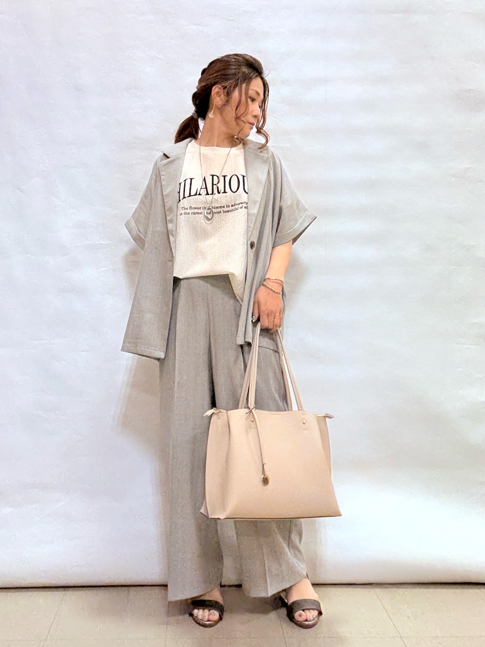 オン・オフどちらもおすすめ! ジャケット&パンツのセットアップコーデです♪ ロゴTシャツをプラスしてカジュアルダウンしました♡
