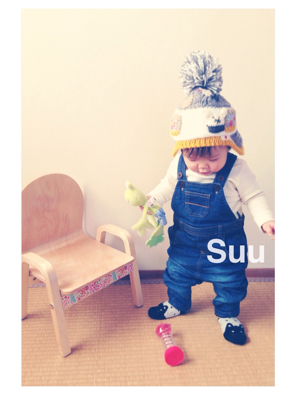 nextのサロペはboysの、 しかもnewborn9-12mだから 足のあたりおかしなライン〜(๑′ᴗ‵๑)ププ。 帽子はおばーちゃんからのプレゼント。 ねずみさんととりさんが編まれてます。 10秒で取るよ!