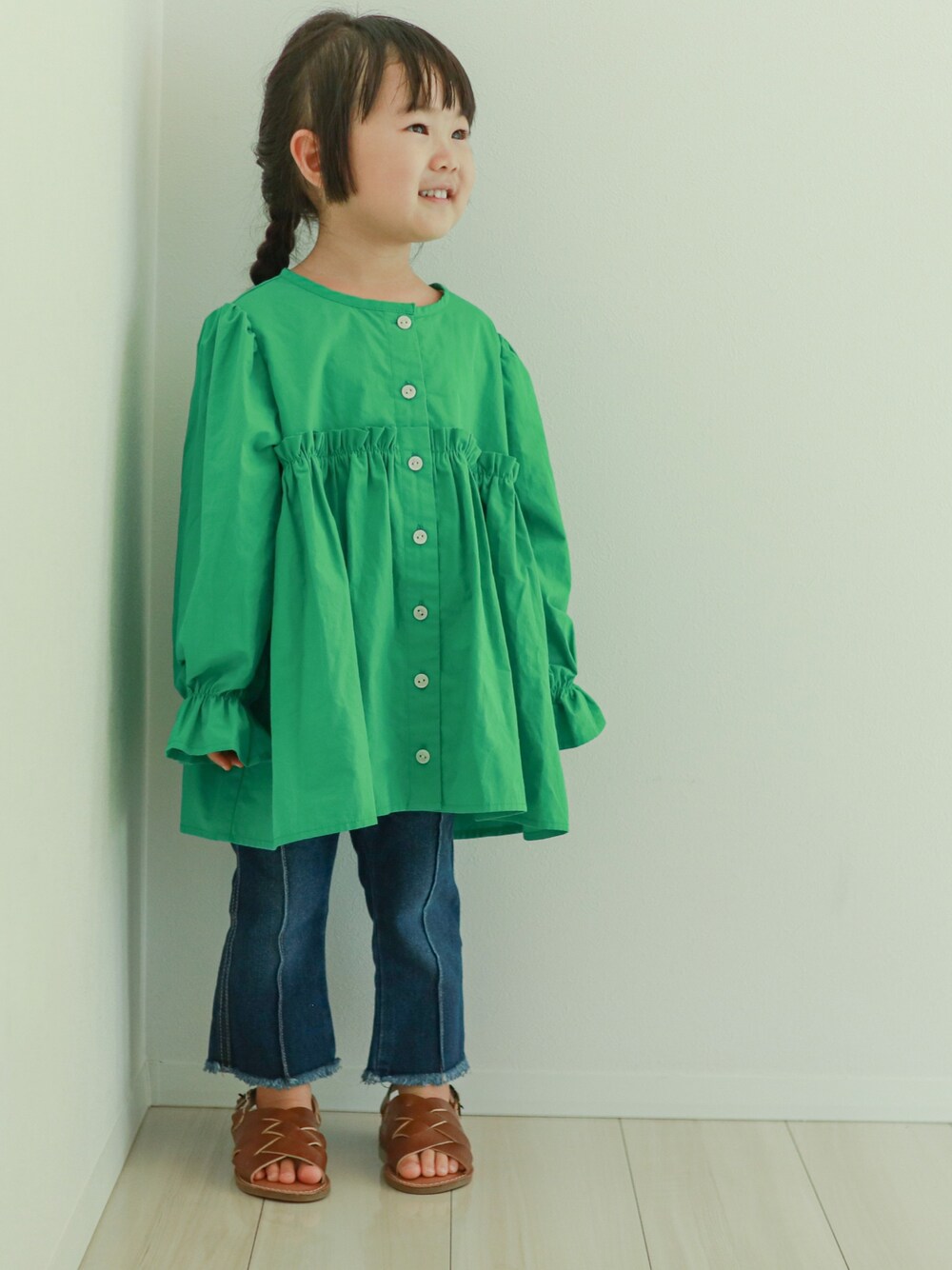 たっぷりなギャザーでふんわりシルエットが 可愛いブラウス♡ 肩のパフ具合、袖口の絞り、胸元から背中まで ぐるっと一周あるギャザー ✨ どこから見ても抜かりなく可愛いです🤭💚 袖口にはゴムがはいっているから 腕まくりしてボリューム出しても可愛いし ママ的には手洗う時とか落ちてこなくて 楽チンポイント☝︎ ̖́- 今回はシンプルにジーンズと合わせて 大人かわいいカジュアルスタイル𓍯