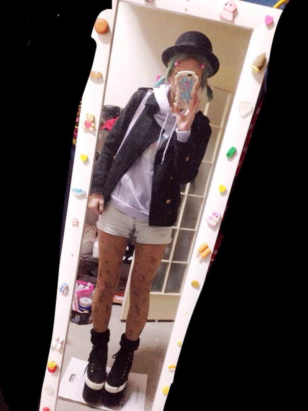 帽子>>>WEGO パーカー>>>WEGO ジャケット>>>NOブランド ショーパン>>>Bershka タイツ>>>NOブランド ルーズソックス>>>tutuanna 厚底スニーカー>>>jouetie 夜寒かった もうコートかなぁー