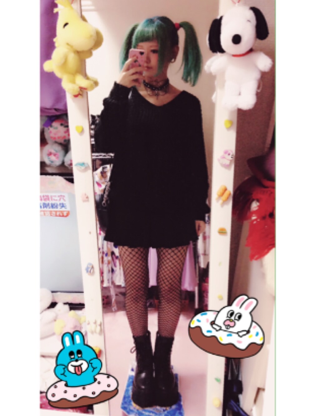 髪色緑になりました! が!!前髪を切りすぎた😭💔 全身真っ黒darkgirl😈💄💋 これからはニットを着る楽しみが増えますね〜🦄