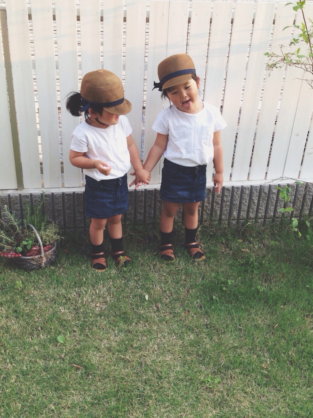 その他のデニムスカート、ブラウン系のキャップを着用したキッズの春コーディネートの1枚目の写真