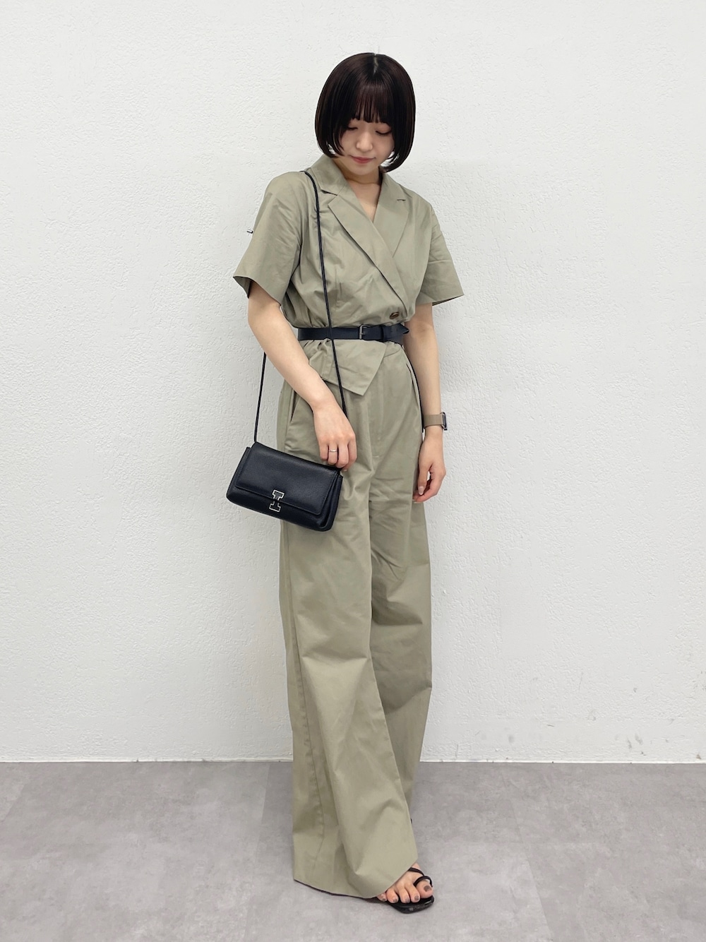 カーキのオールインワンコーデ! 小物はブラックでまとめて引き締めました! Instagram : @imusuka_