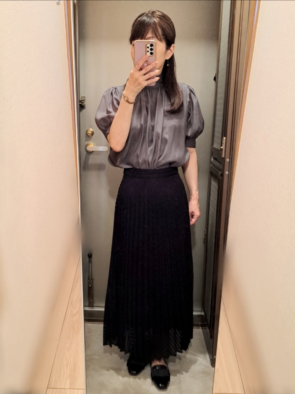 昨日一昨日と曇りや雨で、湿度高くても気温は低かったので、昨日の最高気温プラス4度という今日の予想最高気温ぎ、ハイネックシアーブラウスでは襟元暑いのではないかという不安が⤵️ ☁ 予想最高気温 35度