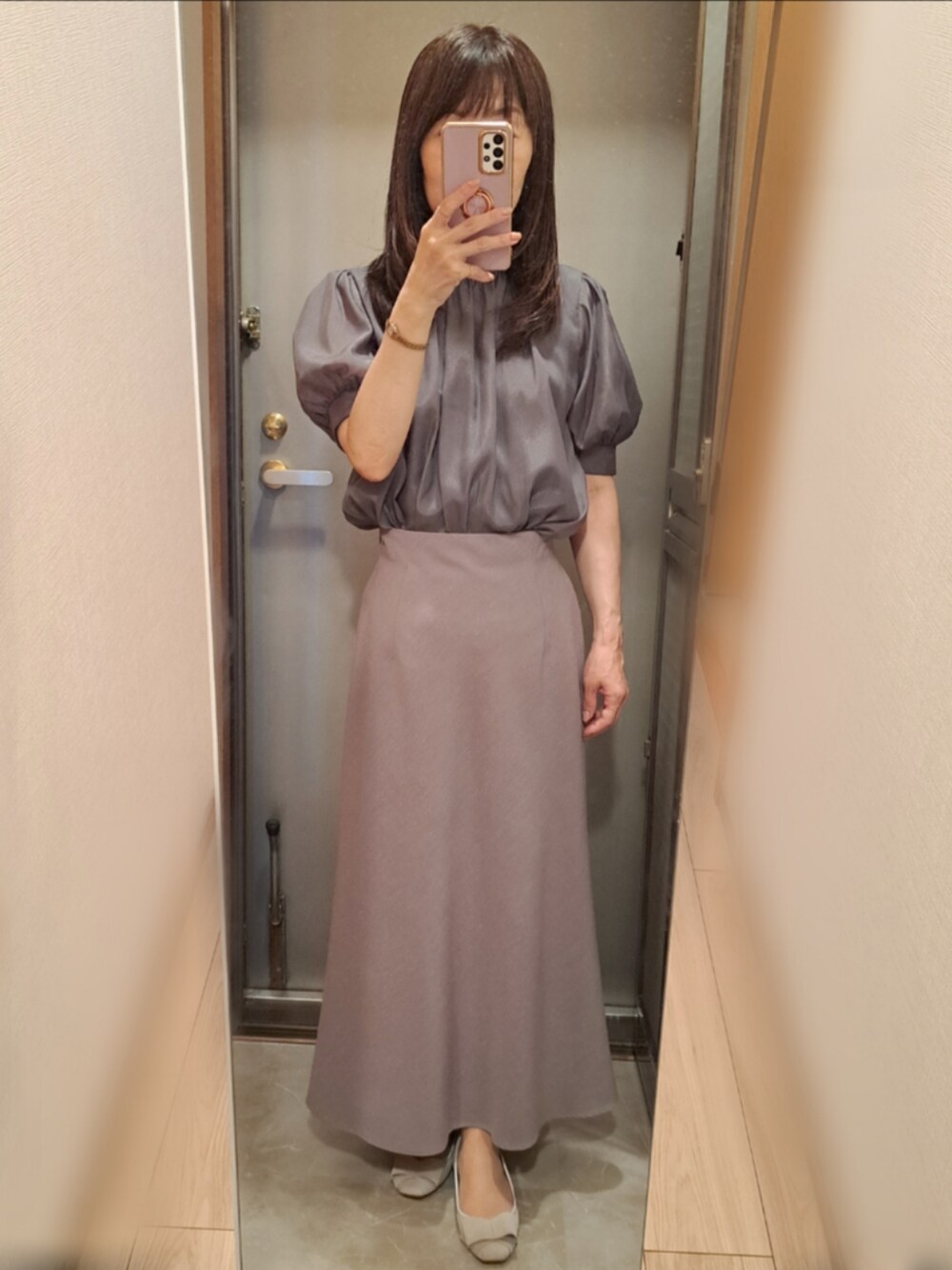 湿度のせいか月曜日の朝から体が重だるい⤵️ 今日はブラウスからパンプスまで、色味の違うグレーの濃淡コーデで👍 バイアスナロースカート、生地を斜めにとっているので落ち感がキレイ✨ ☀時々☁ 予想最高気温 34度